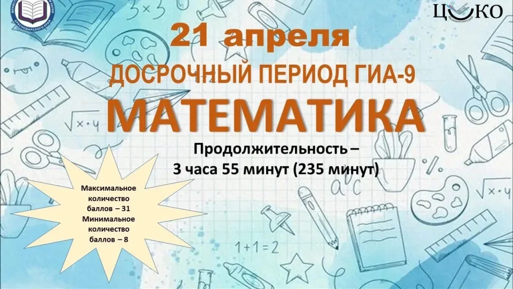 Девятиклассники сдадут экзамен по учебному предмету «Математика». Экзамен начнется в 10:00 часов, его продолжительность составит 3 часа 55 минут (235 минут). Максимальное количество баллов, которое может получить участник экзамена, – 31 балл. Минимальное количество баллов – 8 (из них за выполнение заданий по геометрии необходимо набрать не менее 2 баллов).